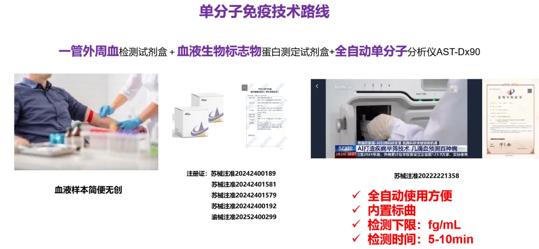 目前,宇測(cè)生物基于完全自主知識(shí)產(chǎn)權(quán)的領(lǐng)先單分子免疫檢測(cè)技術(shù),檢測(cè)靈敏度可達(dá) fg/mL 量級(jí),能夠準(zhǔn)確檢測(cè)出血液中濃度極低的p-tau生物標(biāo)志物的微量變化,全自動(dòng)操作流程,10分鐘即可獲得實(shí)驗(yàn)結(jié)果,降低臨床檢測(cè)對(duì)人力和物力的消耗,實(shí)現(xiàn)快速精準(zhǔn)的AD檢測(cè)。