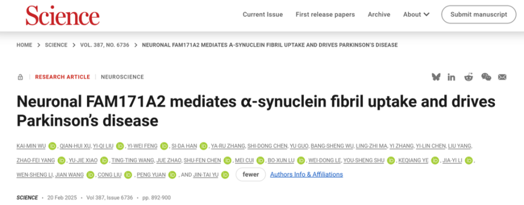 近期,國(guó)家神經(jīng)疾病醫(yī)學(xué)中心、腦功能與腦疾病全國(guó)重點(diǎn)實(shí)驗(yàn)室、復(fù)旦大學(xué)附屬華山醫(yī)院郁金泰團(tuán)隊(duì)發(fā)表于《Science》雜志的原創(chuàng)性成果,首次發(fā)現(xiàn)帕金森病全新治療靶點(diǎn)FAM171A2,揭示了FAM171A2作為神經(jīng)元膜受體在病理性α-syn傳播中的關(guān)鍵作用:通過(guò)特定內(nèi)吞途徑介導(dǎo)α-syn纖維內(nèi)吞的機(jī)制,還發(fā)現(xiàn)潛在抑制劑Bemcentinib,為帕金森病的治療提供了重要的理論依據(jù)和潛在干預(yù)靶點(diǎn)。